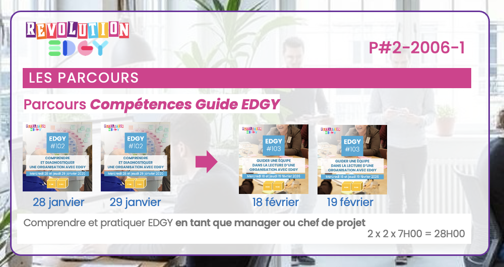 Les formations « Révolution EDGY » s’adressent aux acteurs clés de la performance et de l’évolution de l’entreprise : leaders, managers, accompagnants.